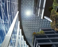 two atria. Glazed lifts and escalators within the atria give